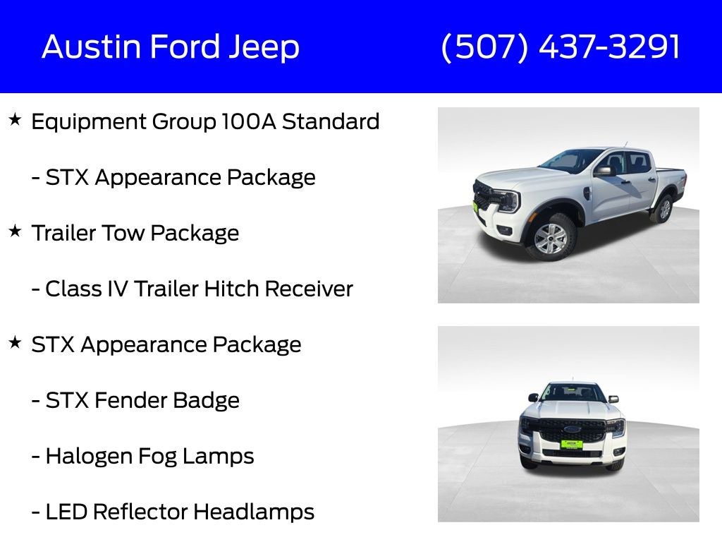 The STX Appearance Package and Trailer Tow Package add an extra layer of style and functionality, ensuring you can haul your gear with confidence. And with an impressive 20 city/24 highway MPG, this Ranger delivers impressive efficiency without sacrificing performance.